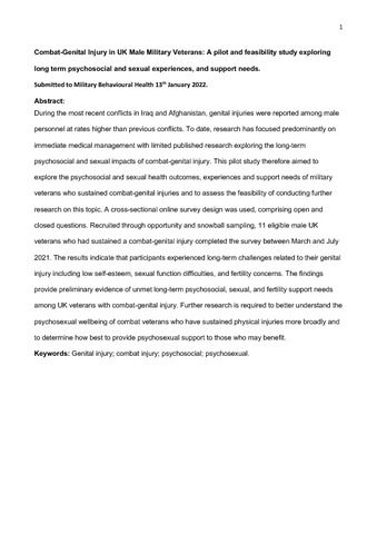 Keeling, Mary ORCID logoORCID: https://orcid.org/0000-0002-3049-6022 and Hammond, Natalie ORCID logoORCID: https://orcid.org/0000-0002-3340-2992 (2024) Combat-genital injury in UK male military veterans: a pilot and feasibility study exploring long-term psychosocial and sexual experiences and support needs. Journal of Military Social Work and Behavioral Health Services, 12 (2). pp. 166-177. ISSN 2836-7472