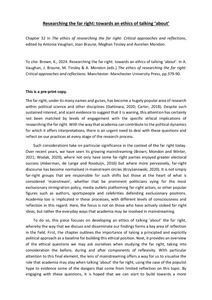 The far right has become a hugely popular area of research, yet there has been limited engagement with the specific ethical implications posed by studying these groups. With the way that academia can contribute to the political dynamics for which it offers interpretations, there is an urgent need to deal with these questions and reflect on our practices. Such considerations take on particular significance in the context of the mainstreaming of the far right that we see today. Not only have some far-right parties enjoyed greater electoral success, but there are many examples of far-right discourse becoming normalised in mainstream circles. It is not simply far-right groups that are responsible for such shifts but those at the heart of what is considered ‘mainstream’, whether that be prominent politicians, media outlets, or other popular figures such as authors, sportspeople, and celebrities defending exclusionary positions. Academia too is implicated in these processes, with different levels of consciousness and reflection in this regard. This chapter focuses on developing an ethics of talking ‘about’ the far right, whereby the way that we disseminate our findings forms a key area of reflection. The lens of mainstreaming offers a way for us to visualise the role that academia may play when talking ‘about’ the far right, using the case of the populist hype to evidence some potential pitfalls. By engaging with these questions, it is hoped that we can start to build towards a more comprehensive ethics of talking ‘about’ the far right within academia.