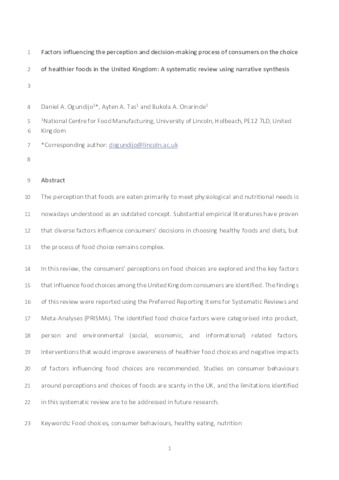 Ogundijo, Daniel A ORCID logoORCID: https://orcid.org/0000-0002-2572-9637, Tas, Ayten A ORCID logoORCID: https://orcid.org/0000-0001-5642-939X and Onarinde, Bukola A (2022) Factors influencing the perception and decision-making process of consumers on the choice of healthier foods in the United Kingdom: a systematic review using narrative synthesis. International Journal of Food Science and Technology, 57 (2). pp. 881-897. ISSN 0950-5423