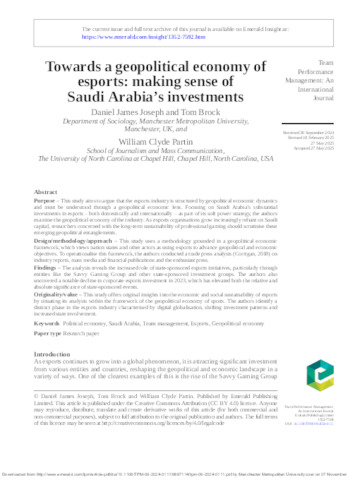 Purpose This study aims to argue that the esports industry is structured by geopolitical economic dynamics and must be understood through a geopolitical economic lens. Focusing on Saudi Arabia’s substantial investments in esports – both domestically and internationally – as part of its soft power strategy, the authors examine the geopolitical economy of the industry. As esports organisations grow increasingly reliant on Saudi capital, researchers concerned with the long-term sustainability of professional gaming should scrutinise these emerging geopolitical entanglements. Design/methodology/approach This study uses a methodology grounded in a geopolitical economic framework, which views nation states and other actors as using esports to advance geopolitical and economic objectives. To operationalise this framework, the authors conducted a trade press analysis (Corrigan, 2018) on industry reports, mass media and financial publications and the enthusiast press. Findings The analysis reveals the increased role of state-sponsored esports initiatives, particularly through entities like the Savvy Gaming Group and other state-sponsored investment groups. The authors also uncovered a notable decline in corporate esports investment in 2023, which has elevated both the relative and absolute significance of state-sponsored events. Originality/value This study offers original insights into the economic and social sustainability of esports by situating its analysis within the framework of the geopolitical economy of sports. The authors identify a distinct phase in the esports industry characterised by digital globalisation, shifting investment patterns and increased state involvement.