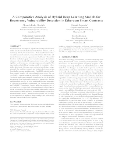 Akoshile, Ahsan Adeleke ORCID logoORCID: https://orcid.org/0009-0000-3070-7750, Jogunola, Olamide ORCID logoORCID: https://orcid.org/0000-0002-2701-9524, Hammoudeh, Mohammad ORCID logoORCID: https://orcid.org/0000-0003-1058-0996 and Dargahi, Tooska ORCID logoORCID: https://orcid.org/0000-0002-0908-6483 (2025) A Comparative Analysis of Hybrid Deep Learning Models for Reentrancy Vulnerability Detection in Ethereum Smart Contracts. In: Proceedings of the 8th International Conference on Future Networks & Distributed Systems, pp. 915-922. Presented at ICFNDS '24: The 8th International Conference on Future Networks & Distributed Systems, 11 - 12 December 2024, Marakech, Morocco.