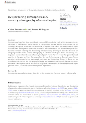 Steadman, Chloe ORCID logoORCID: https://orcid.org/0000-0003-1132-3502 and Millington, Steven ORCID logoORCID: https://orcid.org/0000-0001-5143-3074 (2025) (Dis)ordering atmospheres: A sensory ethnography of a seaside pier. Marketing Theory. ISSN 1470-5931