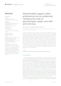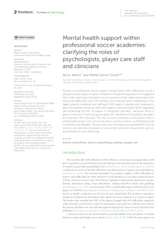 James, Ian and Turner, Martin ORCID logoORCID: https://orcid.org/0000-0003-1975-5561 (2025) Mental Health Support within Professional Soccer Academies: Clarifying the Roles of Psychologists, Player Care Staff and Clinicians. Frontiers in Psychology. 16:1633397. ISSN 1664-1078