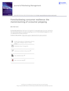 Kerrane, Benedict ORCID logoORCID: https://orcid.org/0000-0003-2114-5965 (2025) Foreshadowing consumer resilience: the mainstreaming of consumer prepping. Journal of Marketing Management, 41 (11-12). pp. 1270-1278. ISSN 0267-257X