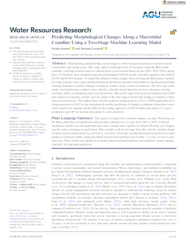 Kumar, Pavitra ORCID logoORCID: https://orcid.org/0000-0002-4683-724X and Leonardi, Nicoletta ORCID logoORCID: https://orcid.org/0000-0002-6211-739X (2025) Predicting Morphological Changes Along a Macrotidal Coastline Using a Two-Stage Machine Learning Model. Water Resources Research, 61 (4). e2024WR037523. ISSN 0043-1397