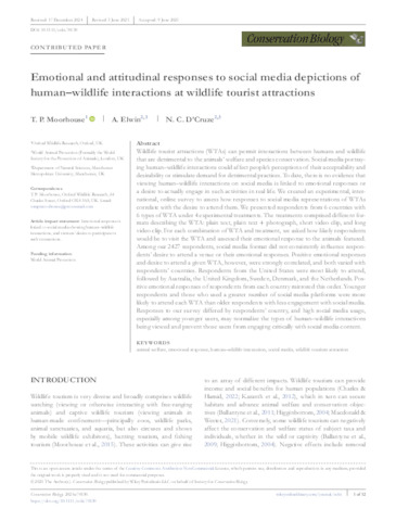 Wildlife tourist attractions (WTAs) can permit interactions between humans and wildlife that are detrimental to the animals’ welfare and species conservation. Social media portraying human–wildlife interactions could affect people's perceptions of their acceptability and desirability or stimulate demand for detrimental practices. To date, there is no evidence that viewing human–wildlife interactions on social media is linked to emotional responses or a desire to actually engage in such activities in real life. We created an experimental, international, online survey to assess how responses to social media representations of WTAs correlate with the desire to attend them. We presented respondents from 6 countries with 6 types of WTA under 4 experimental treatments. The treatments comprised different formats describing the WTA: plain text, plain text + photograph, short video clip, and long video clip. For each combination of WTA and treatment, we asked how likely respondents would be to visit the WTA and assessed their emotional response to the animals featured. Among our 2427 respondents, social media format did not consistently influence respondents’ desire to attend a venue or their emotional responses. Positive emotional responses and desire to attend a given WTA, however, were strongly correlated, and both varied with respondents’ countries. Respondents from the United States were most likely to attend, followed by Australia, the United Kingdom, Sweden, Denmark, and the Netherlands. Positive emotional responses of respondents from each country mirrored this order. Younger respondents and those who used a greater number of social media platforms were more likely to attend each WTA than older respondents with less engagement with social media. Responses to our survey differed by respondents’ country, and high social media usage, especially among younger users, may normalize the types of human–wildlife interactions being viewed and prevent those users from engaging critically with social media content.