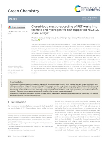 Closed-loop electro-upcycling of PET waste into formate and hydrogen via self-supported NiCo2O4 spinel arrays.