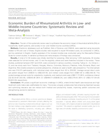 Economic Burden of Rheumatoid Arthritis in Low- and Middle-Income Countries: Systematic Review and Meta-Analysis.