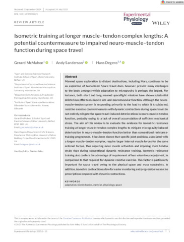 Isometric training at longer muscle-tendon complex lengths: A potential countermeasure to impaired neuro-muscle-tendon function during space travel.