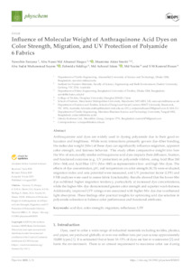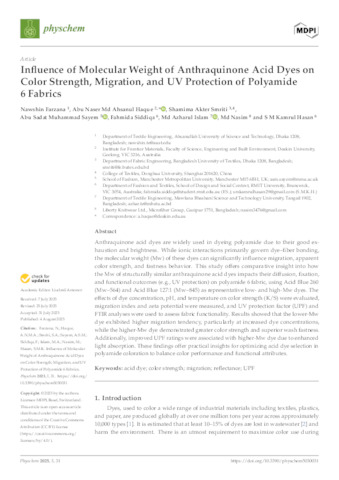 Farzana, Nawshin, Haque, Abu Naser Md Ahsanul ORCID logoORCID: https://orcid.org/0000-0002-5244-1911, Smriti, Shamima Akter, Sayem, Abu Sadat Muhammad ORCID logoORCID: https://orcid.org/0000-0003-3034-7892, Siddiqa, Fahmida, Islam, Md Azharul ORCID logoORCID: https://orcid.org/0000-0002-8521-0765, Nasim, Md and Hasan, SM Kamrul (2025) Influence of Molecular Weight of Anthraquinone Acid Dyes on Color Strength, Migration, and UV Protection of Polyamide 6 Fabrics. Physchem, 5 (3). 31.