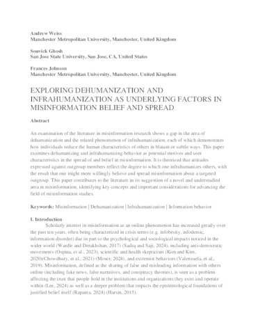 Weiss, Andrew, Ghosh, Souvick and Johnson, Frances ORCID logoORCID: https://orcid.org/0000-0003-0632-9790 (2025) Exploring Dehumanization and Infrahumanization as Underlying Factors in Misinformation Belief and Spread. In: Proceedings of the Annual Conference of CAIS. Presented at Annual Conference of Canadian Association of Information Science / Actes du congrès annuel de l'ACSI, 27 May 2025 - 29 May 2025, Dalhousie University, Canada.