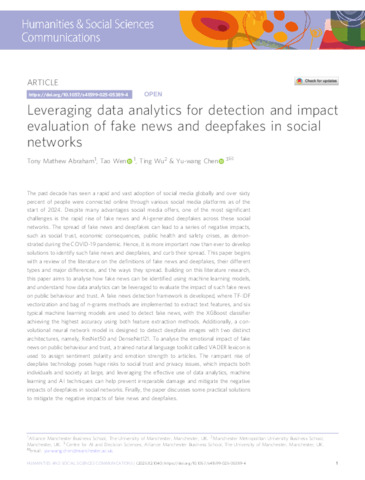Leveraging data analytics for detection and impact evaluation of fake news and deepfakes in social networks.