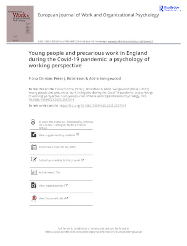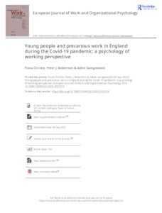 Christie, Fiona ORCID logoORCID: https://orcid.org/0000-0003-1384-3683, Robertson, Peter and Swingewood, Adele ORCID logoORCID: https://orcid.org/0009-0000-5863-8590 (2025) Young people and precarious work in England during the Covid-19 pandemic: a psychology of working perspective. European Journal of Work and Organizational Psychology. ISSN 1359-432X