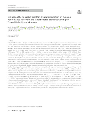 Evaluating the Impact of Urolithin A Supplementation on Running Performance, Recovery, and Mitochondrial Biomarkers in Highly Trained Male Distance Runners.