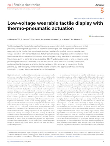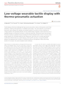Low-voltage wearable tactile display with thermo-pneumatic actuation.