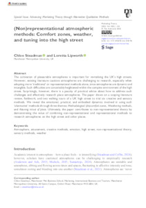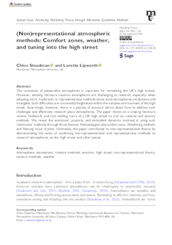 Steadman, Chloe ORCID logoORCID: https://orcid.org/0000-0003-1132-3502 and Lipworth, Loretta (2025) (Non)representational atmospheric methods: Comfort zones, weather, and tuning into the high street. Marketing Theory. pp. 1-34. ISSN 1470-5931