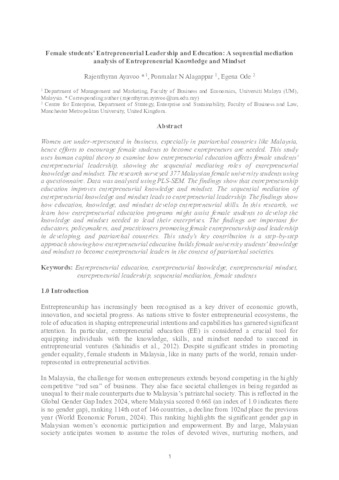 Female students’ entrepreneurial leadership and education: A sequential mediation analysis of entrepreneurial knowledge and mindset.