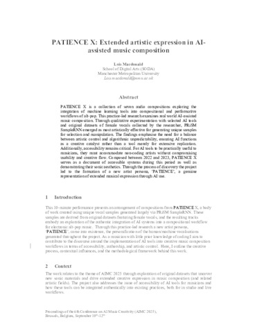 PATIENCE X is a collection of seven audio compositions exploring the integration of machine learning tools into compositional and performative workflows of alt-pop. This practice-led research examines real world AI-assisted music composition. Through qualitative experimentation with selected AI tools and original datasets of female vocals collected by the researcher, PRiSM SampleRNN emerged as most artistically effective for generating unique samples for selection and manipulation. The findings emphasise the need for a balance between artistic control and algorithmic unpredictability, ensuring AI functions as a creative catalyst rather than a tool merely for extensive replication. Additionally, accessibility remains critical. For AI tools to be practically useful to musicians, they must accommodate non-coding artists without compromising usability and creative flow. Composed between 2022 and 2023, PATIENCE X serves as a document of accessible systems during this period as well as demonstrating their sonic aesthetics. Through the process of discovery the project led to the formation of a new artist persona, 'PATIENCE’, a genuine representation of extended musical expression through AI use.