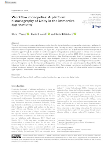 Young, Chris J. ORCID logoORCID: https://orcid.org/0000-0001-9424-6922, Joseph, Daniel J. ORCID logoORCID: https://orcid.org/0000-0003-4628-7417 and Nieborg, David B. ORCID logoORCID: https://orcid.org/0000-0002-3498-789X (2025) Workflow monopolies: A platform historiography of Unity in the immersive app economy. Platforms & Society, 2. 29768624251376562. ISSN 2976-8624