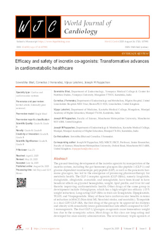 Bhat, Sowrabha, Fernandez, Cornelius J, Lakshmi, Vijaya and Pappachan, Joseph M ORCID logoORCID: https://orcid.org/0000-0003-0886-5255 (2025) Efficacy and safety of incretin co-agonists: Transformative advances in cardiometabolic healthcare. World Journal of Cardiology, 17 (8). 107991. ISSN 1949-8462
