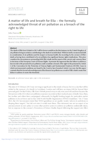 The death of Ella Kissi-Debrah in 2013 will be forever notable as the first instance in the United Kingdom of air pollution being recorded as contributing to the death of an individual. Whilst in itself a monumental shift in consideration of air pollution and the impact on human health, the recording by the coroner of Ella’s death as having been contributed to by air pollution has significant human rights implications. This piece considers the circumstances surrounding both Ella’s death and the report of the coroner and connects these to decisions of the European Court of Human Rights. It presents the argument that the failure to address a known risk to life presented by air pollution could constitute a breach of the right to life protected by Article 2 of the Convention for the Protection of Human Rights and Fundamental Freedoms (ECHR). Cases in which environmental conditions are found by the Court to have breached Article 2 are rare, but this paper contends that the formal acknowledgement of the threat of air pollution as a result of Ella’s death means that failure to address it meets this threshold.