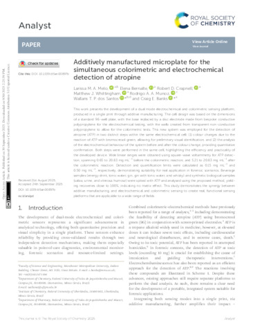 Melo, Larissa ORCID logoORCID: https://orcid.org/0000-0001-6083-3184, Bernalte, Elena ORCID logoORCID: https://orcid.org/0000-0002-0764-789X, Crapnell, Robert D ORCID logoORCID: https://orcid.org/0000-0002-8701-3933, Whittingham, Matthew ORCID logoORCID: https://orcid.org/0000-0003-2700-9008, Munoz, Rodrigo A. A. ORCID logoORCID: https://orcid.org/0000-0001-8230-5825, dos Santos, Wallans ORCID logoORCID: https://orcid.org/0000-0001-6585-9930 and Banks, Craig E ORCID logoORCID: https://orcid.org/0000-0002-0756-9764 (2025) Additively manufactured microplate for the simultaneous colorimetric and electrochemical detection of atropine. Analyst. ISSN 1364-5528