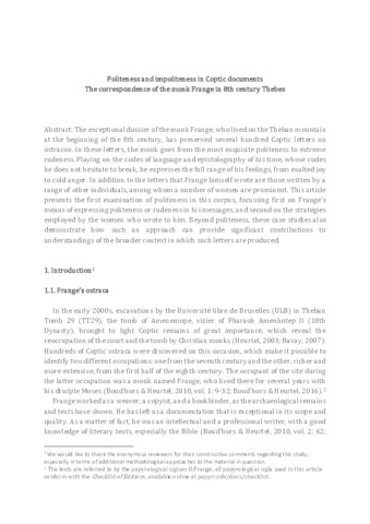 The exceptional dossier of the monk Frange, who lived on the Theban mountain at the beginning of the 8th century, has preserved several hundred Coptic letters on ostracon. In these letters, the monk goes from the most exquisite politeness to extreme rudeness. Playing on the codes of language and epistolography of his time, whose codes he does not hesitate to break, he expresses the full range of his feelings, from exalted joy to cold anger. In addition to the letters that Frange himself wrote are those written by a range of other individuals, among whom a number of women are prominent. This article presents the first examination of politeness in this corpus, focussing first on Frange’s means of expressing politeness or rudeness in his messages, and second on the strategies employed by the women who wrote to him. Beyond politeness, these case studies also demonstrate how such an approach can provide significant contributions to understandings of the broader context in which such letters are produced.