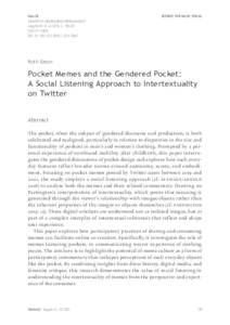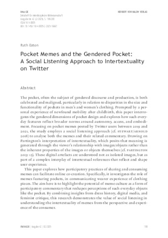 Eaton, Ruth ORCID logoORCID: https://orcid.org/0009-0004-0209-0879 (2025) Pocket Memes and the Gendered Pocket: A Social Listening Approach to Intertextuality on Twitter. IMAGE (Zeitschrift für interdisziplinäre Bildwissenschaft/ Journal for Interdisciplinary Image Science), 42 (2). pp. 190-208. ISSN 1614-0885
