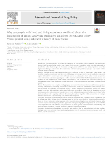 Askew, Rebecca ORCID logoORCID: https://orcid.org/0000-0002-6281-227X and Ritter, Alison ORCID logoORCID: https://orcid.org/0000-0001-9540-1920 (2025) Why are people with lived and living experience conflicted about the legalisation of drugs? Analysing qualitative data from the UK Drug Policy Voices project using Schwartz's theory of basic values. International Journal of Drug Policy, 145. 104936. ISSN 0955-3959