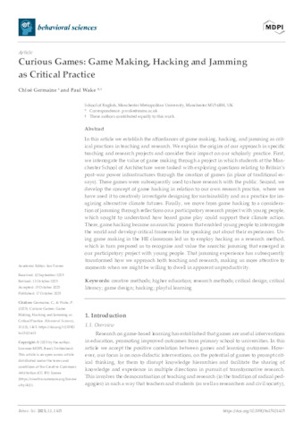 Germaine, Chloe ORCID logoORCID: https://orcid.org/0000-0001-5187-8815 and Wake, Paul ORCID logoORCID: https://orcid.org/0000-0001-8435-7020 (2025) Curious Games: Game Making, Hacking and Jamming as Critical Practice. Behavioral Sciences, 15 (10). 1415.