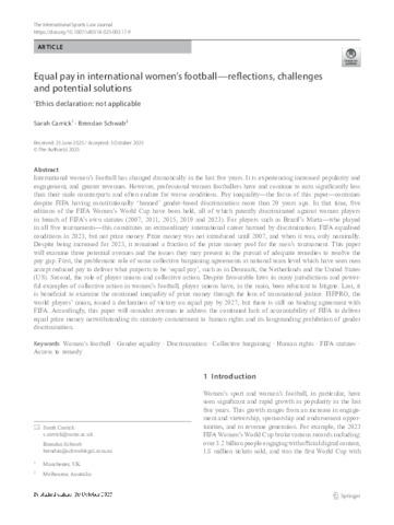 International women’s football has changed dramatically in the last five years. It is experiencing increased popularity and engagement, and greater revenues. However, professional women footballers have and continue to earn significantly less than their male counterparts and often endure far worse conditions. Pay inequality—the focus of this paper—continues despite FIFA having constitutionally ‘banned’ gender-based discrimination more than 20 years ago. In that time, five editions of the FIFA Women’s World Cup have been held, all of which patently discriminated against women players in breach of FIFA’s own statutes (2007, 2011, 2015, 2019 and 2023). For players such as Brazil’s Marta—who played in all five tournaments—this constitutes an extraordinary international career harmed by discrimination. FIFA equalised conditions in 2023, but not prize money. Prize money was not introduced until 2007, and when it was, only nominally. Despite being increased for 2023, it remained a fraction of the prize money pool for the men’s tournament. This paper will examine three potential avenues and the issues they may present in the pursuit of adequate remedies to resolve the pay gap. First, the problematic role of some collective bargaining agreements at national team level which have seen men accept reduced pay to deliver what purports to be ‘equal pay’, such as in Denmark, the Netherlands and the United States (US). Second, the role of player unions and collective action. Despite favourable laws in many jurisdictions and powerful examples of collective action in women’s football, player unions have, in the main, been reluctant to litigate. Last, it is beneficial to examine the continued inequality of prize money through the lens of transnational justice. FIFPRO, the world players’ union, issued a declaration of victory on equal pay by 2027, but there is still no binding agreement with FIFA. Accordingly, this paper will consider avenues to address the continued lack of accountability of FIFA to deliver equal prize money notwithstanding its statutory commitment to human rights and its longstanding prohibition of gender discrimination.