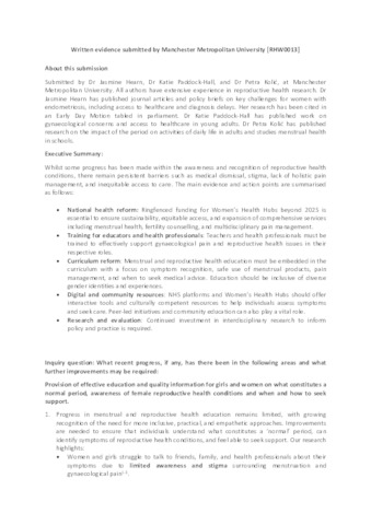 Parliamentary Enquiry - Reproductive health conditions: girls and young women. Written evidence submitted by Manchester Metropolitan University [RHW0013].