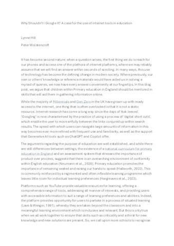 Hill, Lynne and Wolstencroft, Peter ORCID logoORCID: https://orcid.org/0000-0002-2867-8900 (2025) Why shouldn’t I Google it? A case for the use of enhanced internet tools within the primary classroom. British Educational Research Association (BERA).