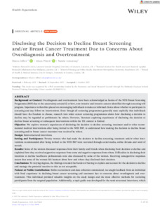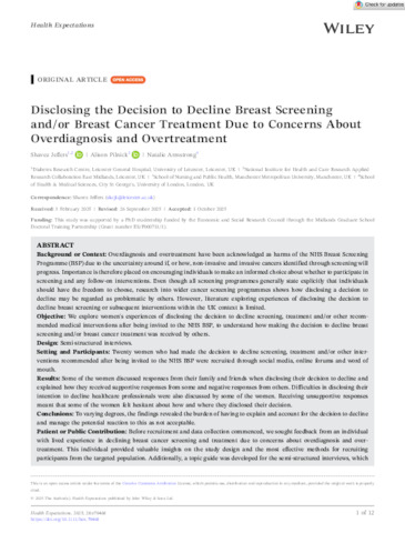 Jeffers, Shavez ORCID logoORCID: https://orcid.org/0000-0001-7542-1772, Pilnick, Alison ORCID logoORCID: https://orcid.org/0000-0003-0987-8760 and Armstrong, Natalie (2025) Disclosing the Decision to Decline Breast Screening and/or Breast Cancer Treatment Due to Concerns About Overdiagnosis and Overtreatment. Health Expectations, 28 (5). e70468. ISSN 1369-6513