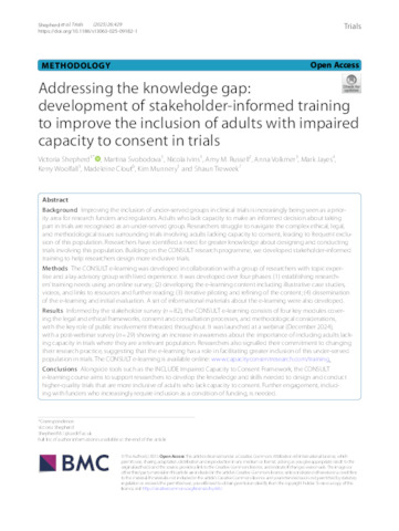 Shepherd, Victoria ORCID logoORCID: https://orcid.org/0000-0002-7687-0817, Svobodova, Martina, Ivins, Nicola, Russell, Amy M, Volkmer, Anna, Jayes, Mark ORCID logoORCID: https://orcid.org/0000-0002-0371-7811, Woolfall, Kerry, Clout, Madeleine, Munnery, Kim and Treweek, Shaun (2025) Addressing the knowledge gap: development of stakeholder-informed training to improve the inclusion of adults with impaired capacity to consent in trials. Trials, 26 (1). 429.
