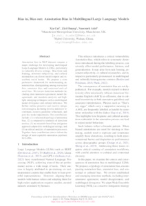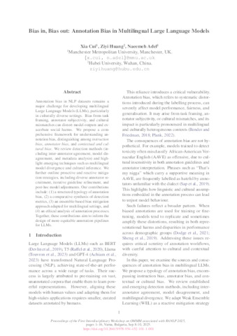 Cui, Xia ORCID logoORCID: https://orcid.org/0000-0002-1726-3814, Huang, Ziyi and Adel, Naomi (2025) Bias in, Bias out: Annotation Bias in Multilingual Large Language Models. In: Proceedings of the First Interdisciplinary Workshop on Observations of Misunderstood, Misguided and Malicious Use of Language Models (OMMM 2025), pp. 1-16. Presented at The 15th International Conference on Recent Advances in Natural Language Processing 2025, 11 September 2025 - 13 September 2025, Varna, Bulgaria.