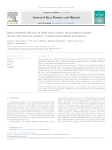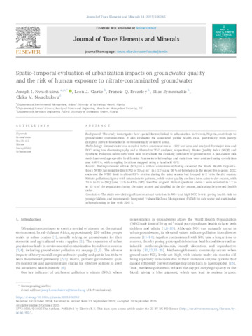 Nwachukwu, Joseph I. ORCID logoORCID: https://orcid.org/0000-0003-3827-5977, Clarke, Leon J. ORCID logoORCID: https://orcid.org/0000-0002-2278-4139, Brearley, Francis Q., Symeonakis, Elias ORCID logoORCID: https://orcid.org/0000-0003-1724-2869 and Nwachukwu, Chika V. (2025) Spatio-temporal evaluation of urbanization impacts on groundwater quality and the risk of human exposure to nitrate-contaminated groundwater. Journal of Trace Elements and Minerals, 14. 100265. ISSN 2773-0506