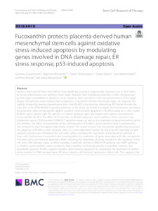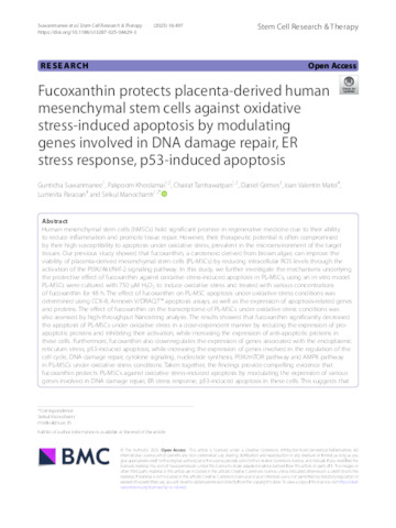 Suwanmanee, Gunticha, Kheolamai, Pakpoom, Tantrawatpan, Chairat, Grimes, Daniel, Matei, Ioan Valentin, Paraoan, Luminita ORCID logoORCID: https://orcid.org/0000-0001-7568-7116 and Manochantr, Sirikul ORCID logoORCID: https://orcid.org/0000-0003-0565-3441 (2025) Fucoxanthin protects placenta-derived human mesenchymal stem cells against oxidative stress-induced apoptosis by modulating genes involved in DNA damage repair, ER stress response, p53-induced apoptosis. Stem Cell Research and Therapy, 16. 497.