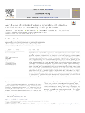 Zhang, X, Han, L ORCID logoORCID: https://orcid.org/0000-0003-2491-7473, Davies, S ORCID logoORCID: https://orcid.org/0000-0001-5330-5527, Sobeih, T, Han, L and Dancey, D ORCID logoORCID: https://orcid.org/0000-0001-7251-8958 (2025) A novel energy-efficient spike transformer network for depth estimation from event cameras via cross-modality knowledge distillation. Neurocomputing, 658. 131745. ISSN 0925-2312